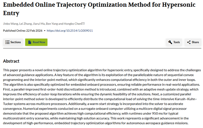 高超声速飞行器在进入大气层过程中面临极大的挑战,其优化问题具有高度非线性的动力学和非凸约束,该研究提出了一种新型嵌入式在线轨迹优化算法,用于解决先进制导应用中的挑战。文章利用了多核处理器日益成熟的特点,在算法的各个层面采用了并行加速策略,从而实现了显著的计算加速,提高了解决方案的准确性以及在弹/箭/机载应用中的适用性。该研究中的定制化并行内点法成功应用于2026年1月12日的火箭子级百公里大气再入闭环制导飞行试验,实现“顶刊+闭环制导飞行试验”的双重里程碑。